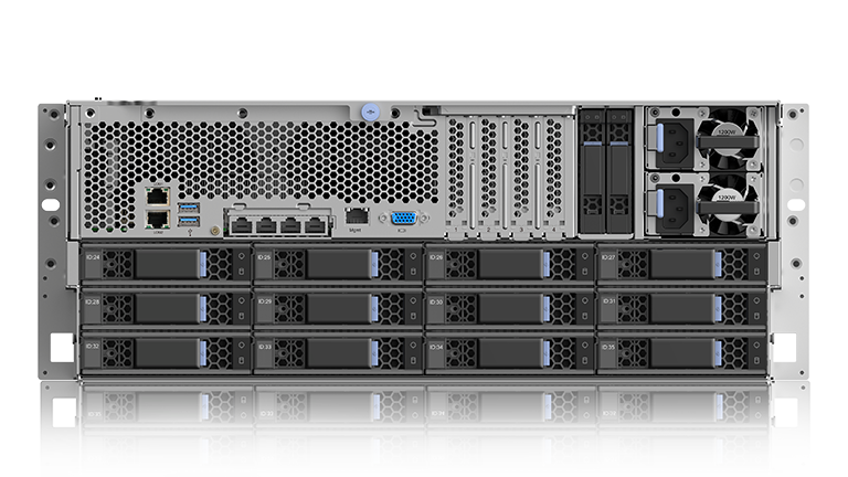 采用4U 标准机架式设计,采用高密度存储以及独特的散热结构、关键性部件冗余设计,集存储、计算、高可靠性于一身
