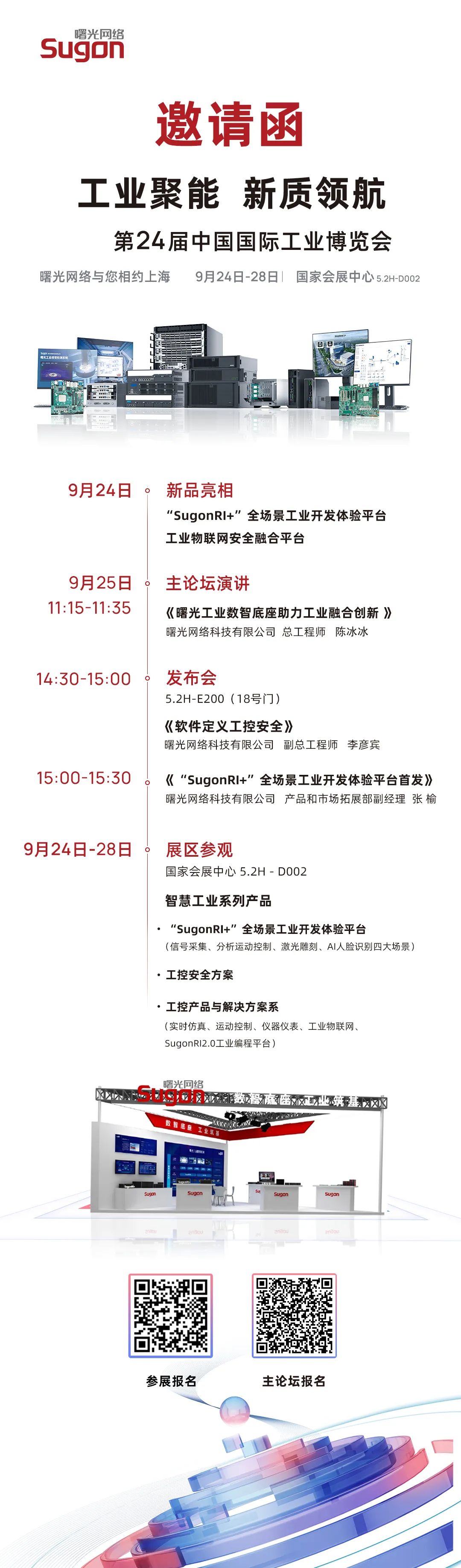 9月24日,中国国际工业博览会即将正式召开。尊龙凯时网络将携最新国产工业数智底座技术产品与多重解决方案亮相展会,同时还将首发全场景工业开发体验平台“SugonRI+”与工业物联网安全融合平台,重磅惊喜,敬请期待!